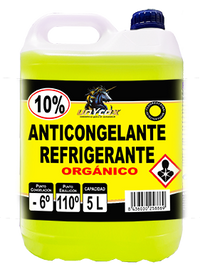 ANTICONGELANTE 10% | ANTICONGELANTE 10% ORGÁNICO Características: -Protección moderada contra el frío: Este tipo de anticongelante es adecuado para zonas donde las temperaturas no caen por debajo de -6°C. -Protección contra sobrecalentamiento: La elevación del punto de ebullición a 110°C ayuda a mantener el motor dentro de un rango seguro de temperatura en condiciones de alta exigencia o clima caluroso. -Propiedades anticorrosivas: El anticongelantes también tiene aditivos que protegen las partes metálicas del sistema de enfriamiento de la corrosión y la formación de depósitos. - No debe mezclarse con agua, para no mermar las prestaciones del producto. - Permite ver las detección de fugas. Usar un anticongelante con las especificaciones adecuadas para la región donde se conduce y las condiciones del vehículo es clave para proteger el motor de daños causados por sobrecalentamiento en climas cálidos o por congelación en climas fríos. Además, un buen anticongelante evita la corrosión en el sistema de enfriamiento, prolongando la vida útil de las piezas del motor y manteniendo un rendimiento óptimo. - Punto de congelación: -6ºC - Punto Ebullición: 110ºC.