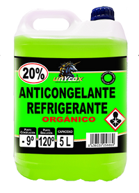 | ANTICONGELANTE 20% ORGÁNICO Características: -Protección moderada contra el frío. -Protección contra sobrecalentamiento: La elevación del punto de ebullición a 120°C ayuda a mantener el motor dentro de un rango seguro de temperatura en condiciones de alta exigencia o clima caluroso. -Propiedades anticorrosivas: El anticongelantes también tiene aditivos que protegen las partes metálicas del sistema de enfriamiento de la corrosión y la formación de depósitos. - No debe mezclarse con agua, para no mermar las prestaciones del producto. - Permite ver las detección de fugas. - Usar un anticongelante con las especificaciones adecuadas para la región donde se conduce y las condiciones del vehículo es clave para proteger el motor de daños causados por sobrecalentamiento en climas cálidos o por congelación en climas fríos. Además, un buen anticongelante evita la corrosión en el sistema de enfriamiento, prolongando la vida útil de las piezas del motor y manteniendo un rendimiento óptimo. - Punto de congelación: -9ºC - Punto Ebullición: 120ºC.
