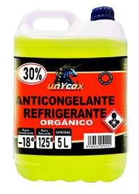 | ANTICONGELANTE 30% ORGÁNICO Características: - Multimetal, especialmente indicado para radiadores de aluminio. - Compatible con todos los elementos de acero, fundición, aluminio, cobre, latón, tubos de goma y soldaduras. - Formulado y aditivado para proteger el motor, radiador y el circuito de refrigeración de cualquier tipo de corrosión. - No contiene nitratos ni aminas, lo que impide la aparición de las peligrosas Nitrosaminas. - Contiene monoetilenglicol, agua desionizada, agentes antioxidantes y antiespumantes. - Aumento del punto de ebullición. - Gran capacidad para transmitir el exceso de calor del motor a la atmósfera. - Nula formación de espuma y de depósitos. - Punto de congelación: -18ºC. - Punto Ebullición: 125ºC. Envase de 1L, 5L, 200L, 1.000 Litros